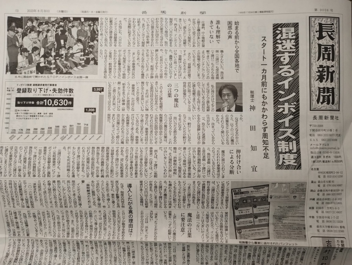 「長周新聞」の1面~2面にわたり「混迷するインボイス制度」の記事が掲載されました。コロナの病み上がりでヘロヘロフラフラになりながら企画をし原稿を書き上げたものです。9月4日(記事の最後の部分)のことがあるから急ピッチで仕上げました。長周新聞さんもスピーディーに動いてくれました。感謝です。