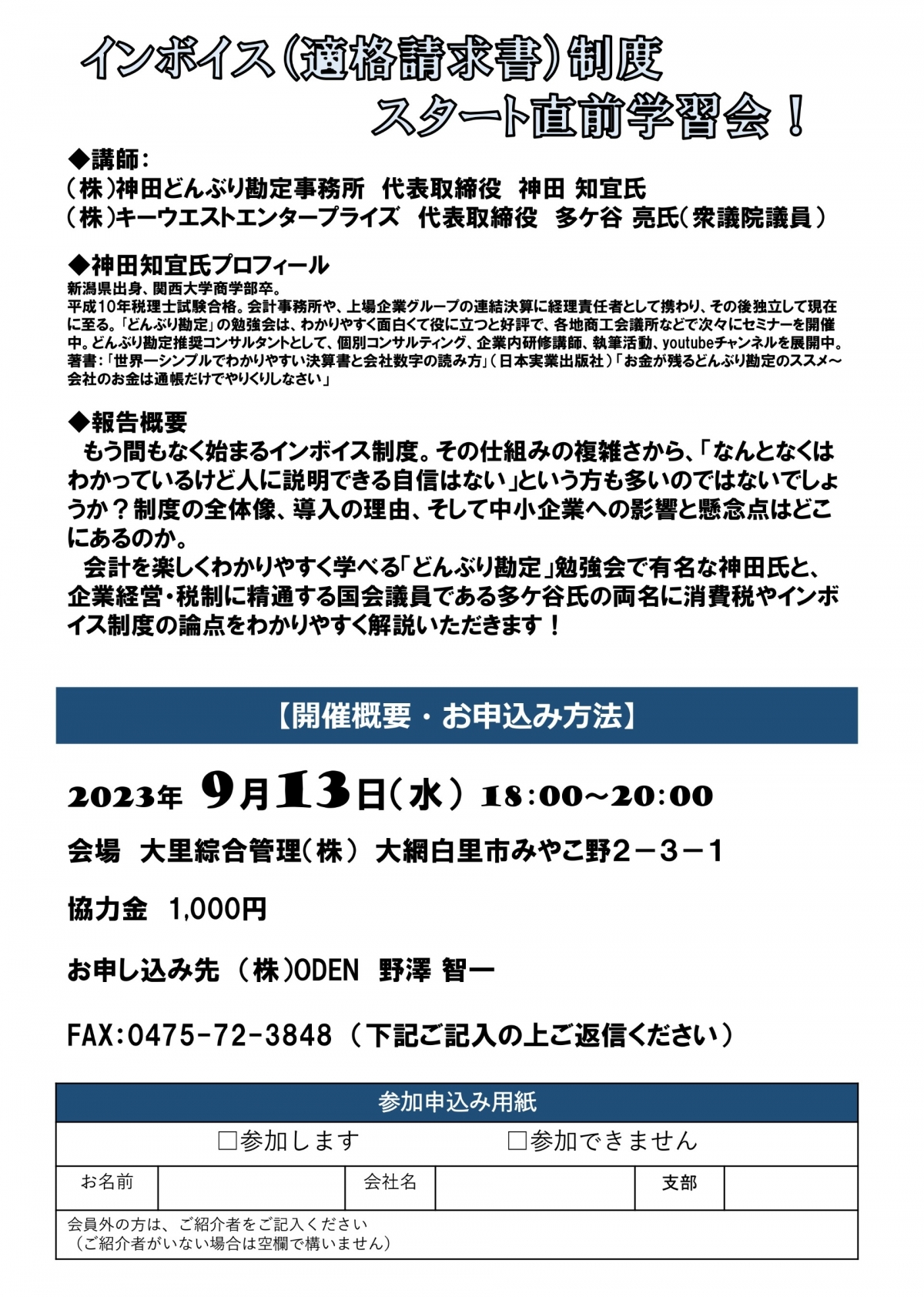 9月13日たがや亮衆議院議員とコラボ「消費税・インボイス学習会」in千葉県茂原市の講師をやります。